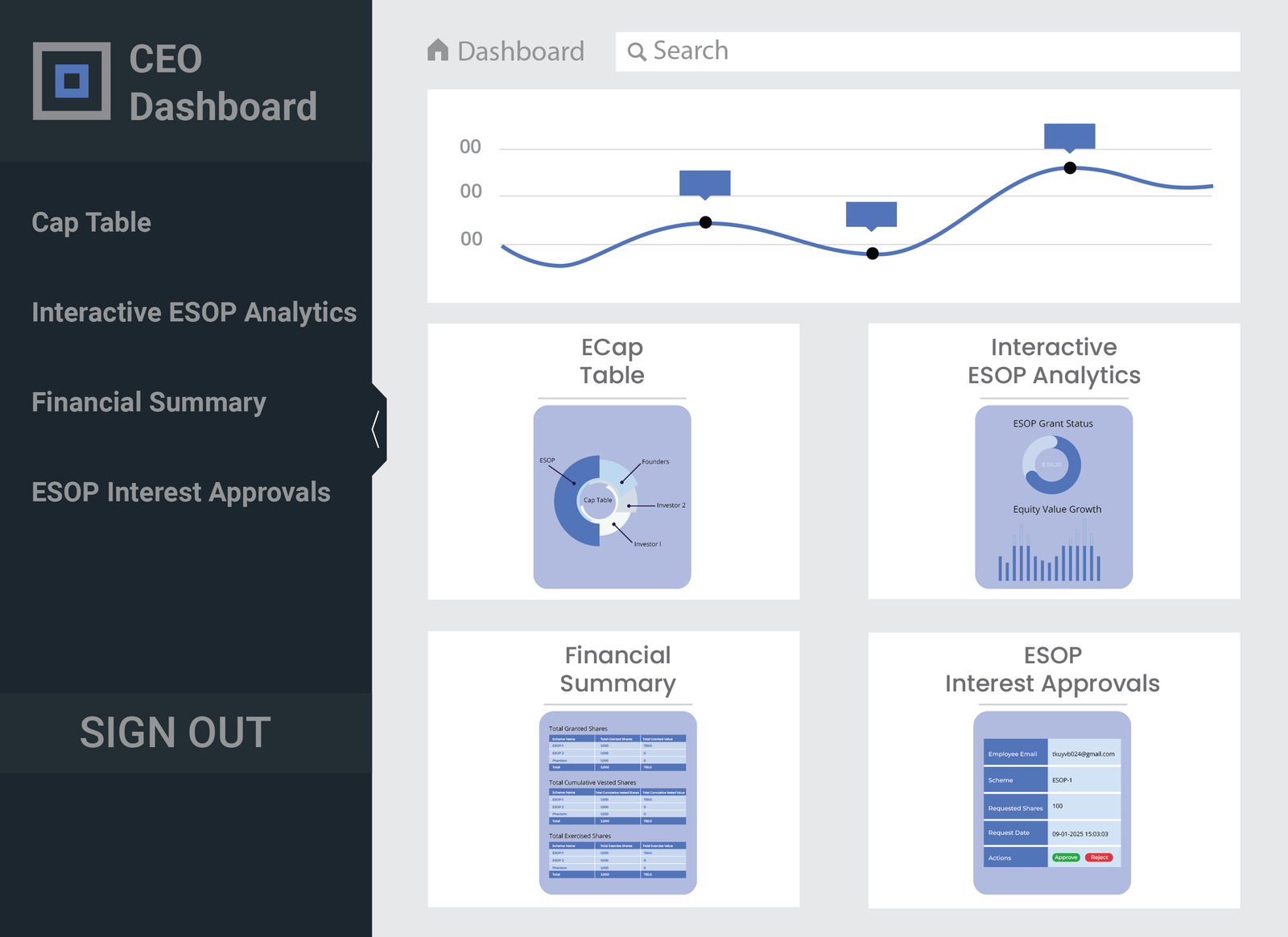 The CEO Dashboard provides a comprehensive view of ESOP distribution, shareholding data, and financial insights to drive strategic decisions.